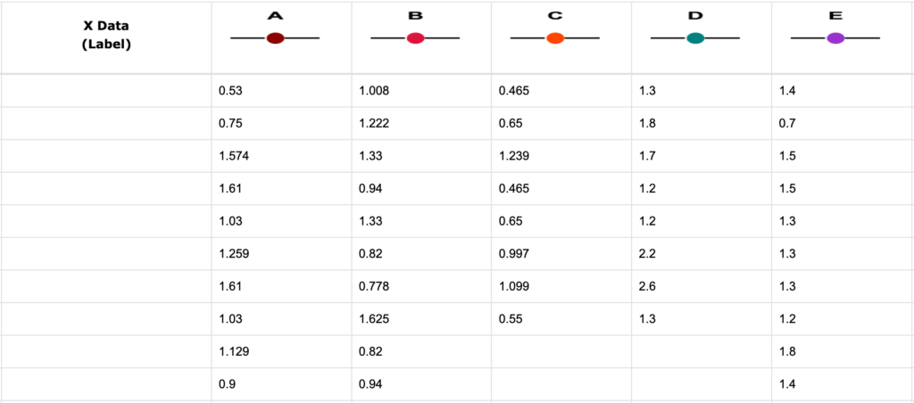 When you choose “Box” from the Graph Type icon menu, you will notice the X Axis, Y Axis, and Curves & Error Bars options are not available for Box-Whisker graphs. However, Titles and Settings icons are still available to add titles and set the styles for the chart. Data for a Box-Whisker graph is always entered in Graph Series A through P. The X Data column is not used. Below is an example of a Box-Whisker graph with five columns of sample data. To label Graph series A as “Sample A”, Graph series B as “Sample B”, etc. as X Axis tic labels, click on Settings to show the Box-Whisker Chart Settings menu and then select the Legend field for each graph series to change the legend text.