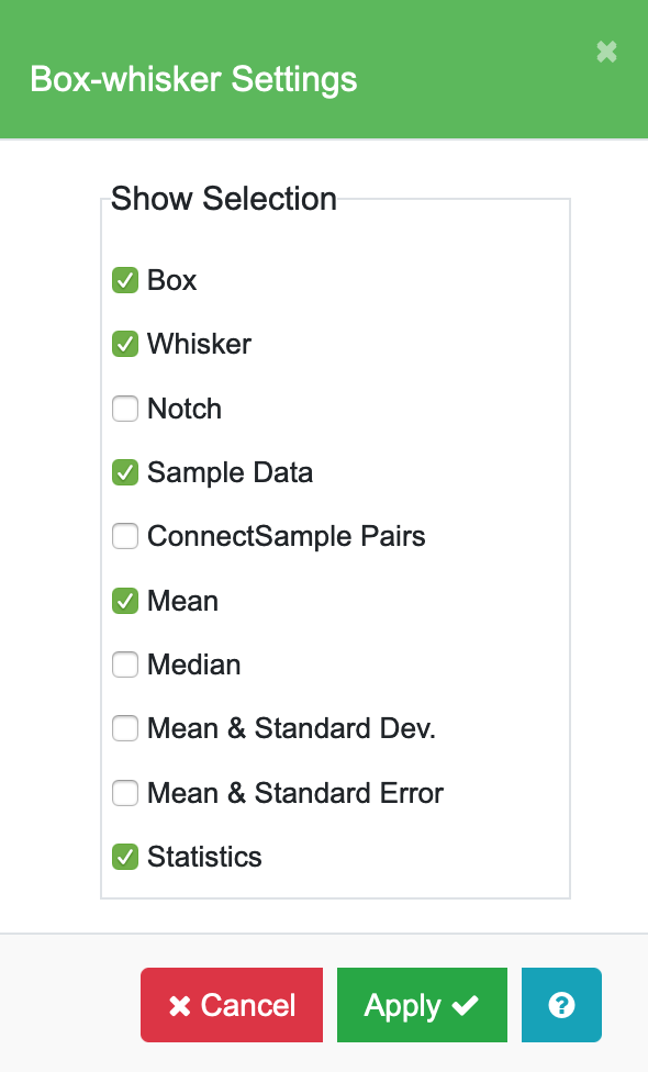 | Mean & Standard Dev | Enabling this option draws an error bar showing the Mean and Standard Deviation (to the right of the box if it is plotted). |