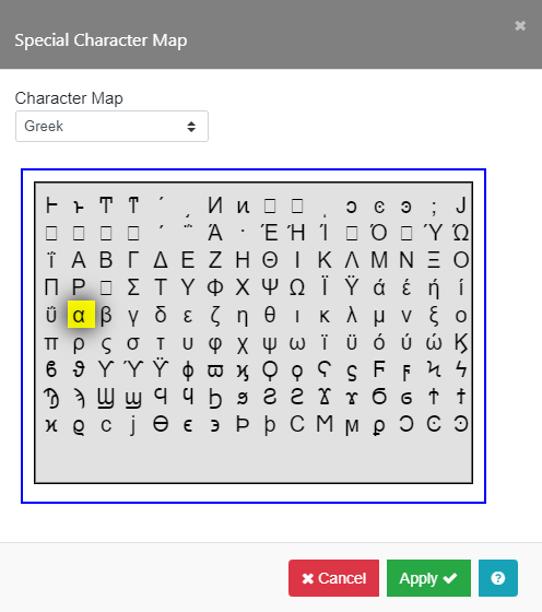Note: If you want to add a special character to the end of a title/label, it is best that you move the cursor position to the end of the title before you click on Special Character Map (c). If you want to insert a special character in the middle of a title, you should move your cursor to the position in the title that you want to insert before clicking on Special Character Map.
