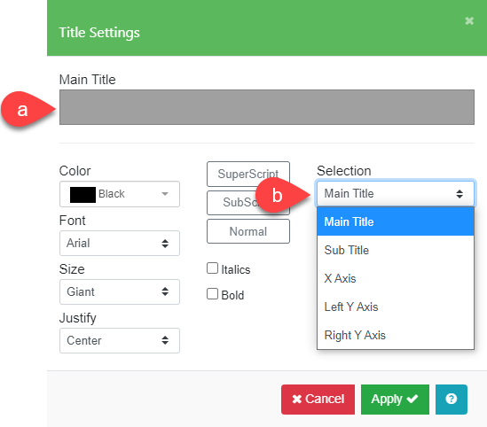 Enter a single line of text for each title on your graph in the Main Title field (a). In the Selection field (b), you can select the Main Title, Sub-Title, titles for the X axes, titles for the left and right Y axes.
