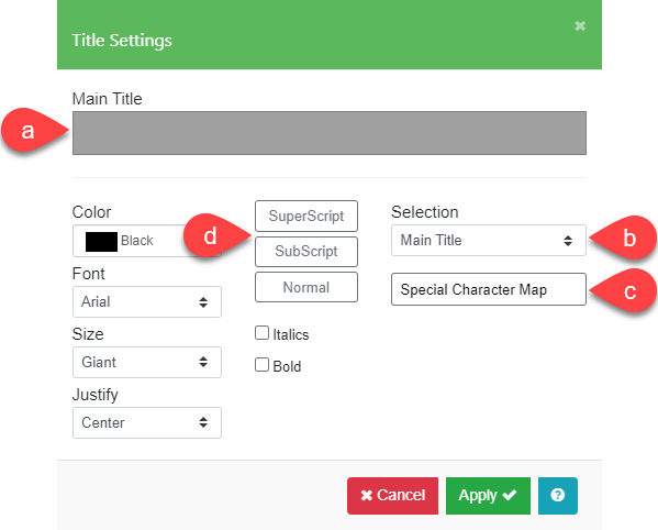 Example: Display “Best Fit is y = 3(x-2)+1″ as the Main Title. First, enter “Best Fit is y = 3(x-2)+1” in the Main Title field. To display “(x-2)” in superscript mode, highlight the appropriate section of text and then click the SuperScript button. The Main Title will be reformatted and displayed with the proper superscript format.