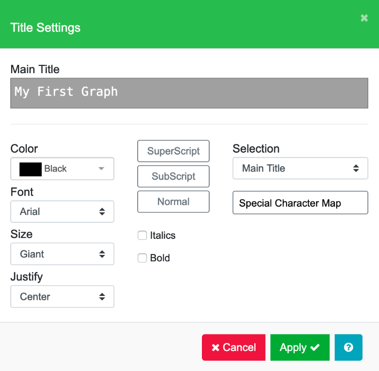 In the Main Title field, enter a title (e.g. “My First Graph”) and then click Apply. The title will appear on the graph.