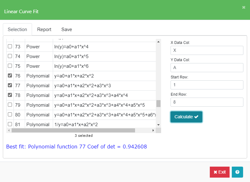 - Click Calculate. After a successful fit calculation, the Coefficient of Determination of 0.942608 for the best fitted polynomial equation is shown at the bottom of the menu. In this case, equation 77, the third order polynomial, was the best fit.