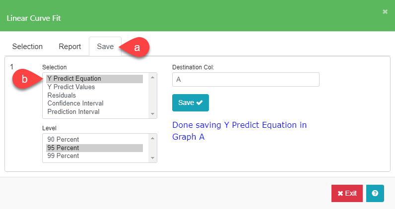- Select the Save tab (a) in the Linear Curve Fit Menu. Select “Y Predict Equation” (b) from the Selection list. Enter “A” in the Destination Col field and click Save. A curve fit equation is generated and saved in the Graph A Equation field of the Curves and Error Bars menu in the Edit Chart tab.
