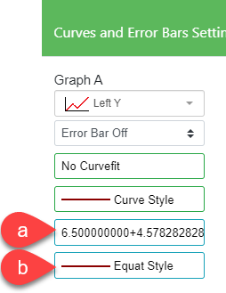 - Click on Edit Chart tab and then click on the Curves and Error Bars icon. The equation field (a) shows the Y Predict Equation that was saved from Step 6. Click on the Equation Style field (b) and the Equation Style menu appears. Change Equat Color to “Black”, the Line Thickness to “2-Thickness”, and Line Type to “4-LineType”. Fill Color does not matter in this case.