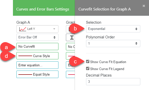 - Click on the Curves and Error Bars icon in the side menu. Click on the No Curvefit field (a) and the Curvefit Selection for Graph A submenu will appear. Select “Exponential” from the Selection field (b).
